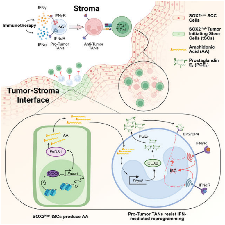 文章摘要:肿瘤相关中性粒细胞(TANs)的异质性特征已被学界认知,但其不同细胞状态的形成机制、动态演变、分布规律及对癌症免疫治疗效果的影响仍不明确。通过单细胞RNA测序、空间转录组学分析和基因操作技术,我们发现抗PD-L1+CD40激动剂免疫治疗可诱导TANs产生干扰素应答,使其在鳞状细胞癌(SCCs)中恢复抗肿瘤活性。与之相反,位于肿瘤-间质界面的TANs则能维持其免疫抑制状态。值得注意的是,我们在肿瘤-间质界面发现了一组SOX2高表达的肿瘤起始干细胞(tSCs),这些细胞通过上调脂肪酸去饱和酶1(Fads1)生成花生四烯酸(AA)。这一tSCs特异性通路增强了TANs中前列腺素E2(PGE2)信号传导,从而破坏干扰素应答并阻碍其抗肿瘤功能。通过精细调控中性粒细胞的可塑性,tSCs塑造了中性粒细胞的异质性特征,并构建了保护性微环境以抵御免疫治疗,进而驱动癌症复发。