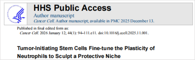 标题:Cancer cell:肿瘤起始干细胞通过精细调控中性粒细胞的可塑性来塑造保护性微环境
