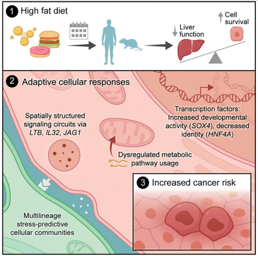 文章摘要:在慢性应激状态下,细胞必须同时维持组织功能与自身存活。肝细胞承担着代谢、合成及解毒功能,但长期营养失衡可诱导肝细胞死亡并诱发代谢功能障碍相关脂肪性肝炎(MASH,原称NASH)。尽管既往研究已明确应激诱导肝细胞死亡的驱动因素,但慢性应激对存活细胞的功能影响仍不明确。通过跨物种纵向单细胞多组学分析,我们发现持续应激会驱动非转化肝细胞中预后性发育及癌症相关程序,同时降低其成熟功能特性。通过构建整合性计算方法,我们鉴定并实验验证了干扰肝细胞功能平衡、应激下增殖增强及直接启动未来肿瘤发生的主调控因子。通过对人类组织微阵列空间转录组学进行地理回归分析,我们揭示了空间结构化的多细胞群落及调控应激反应的信号互作网络。本研究阐明了细胞早期应对慢性应激的机制如何为未来肿瘤发生及结局奠定基础,将多种细胞功能障碍模式统一于核心可干预机制之下。